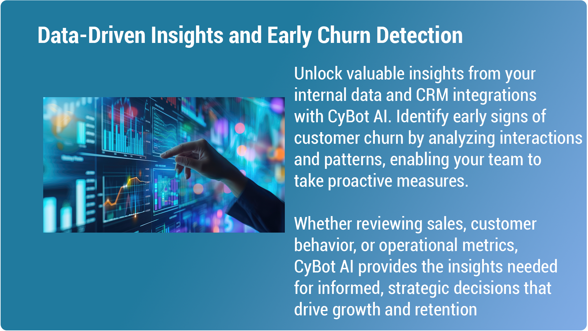 Gain valuable insights into your operations, customer behavior, and internal data with AI for business intelligence. CyBot AI’s AI-driven CRM integration helps identify early signs of customer churn, enabling proactive retention strategies. Whether analyzing sales metrics, customer interactions, or operational data, AI for customer retention provides your business with the tools to make data-driven, strategic decisions that foster growth and long-term success.