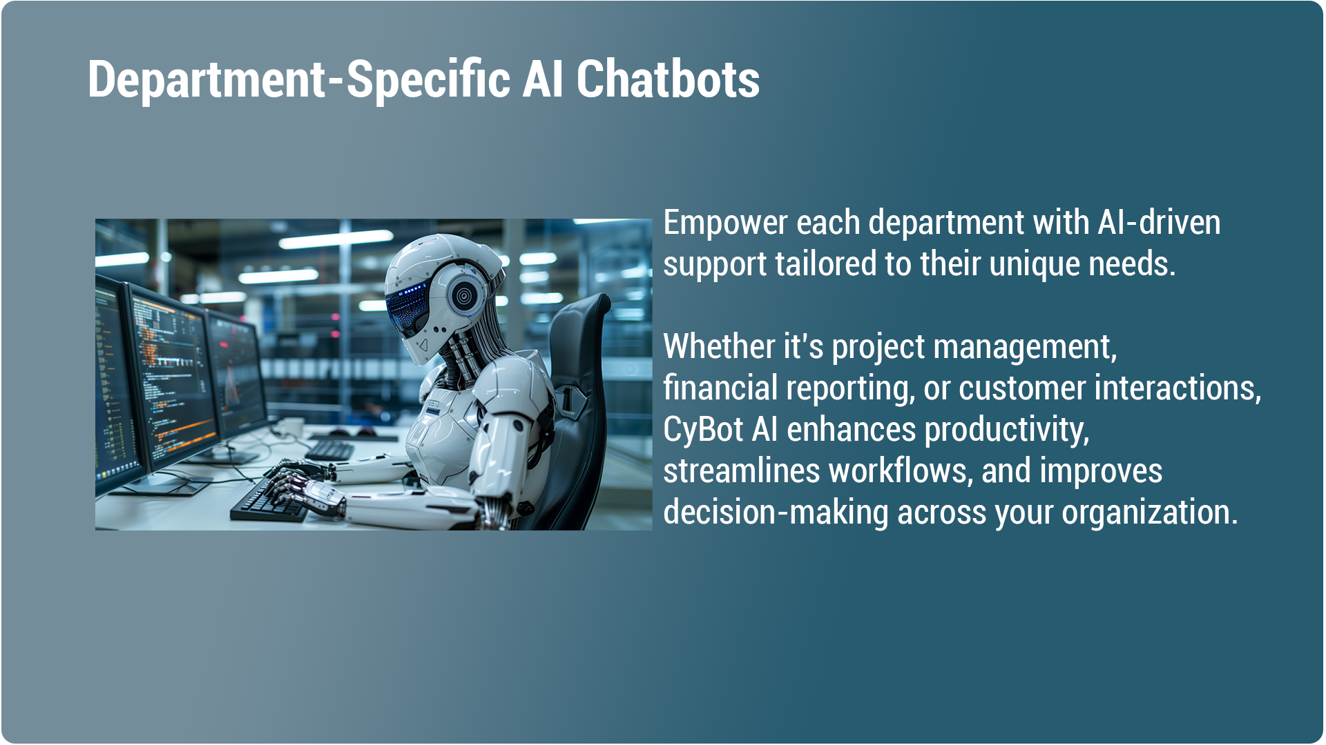 CyBot AI empowers your team with department-specific AI solutions for business that streamline workflows, optimize knowledge sharing, and boost overall efficiency. Empower your organization to streamline processes, optimize workforce productivity, and ensure a seamless path to strategic growth.