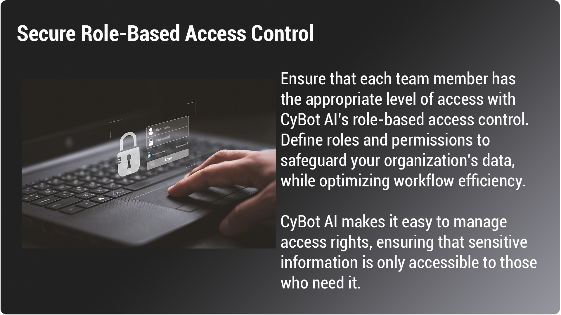 Optimize security and workflow efficiency with AI-powered role-based access control. CyBot AI makes it easy to assign roles and permissions, ensuring that sensitive business data is only accessible to authorized personnel. With AI-driven access management, your organization maintains strict control over critical information while improving overall workflow efficiency.